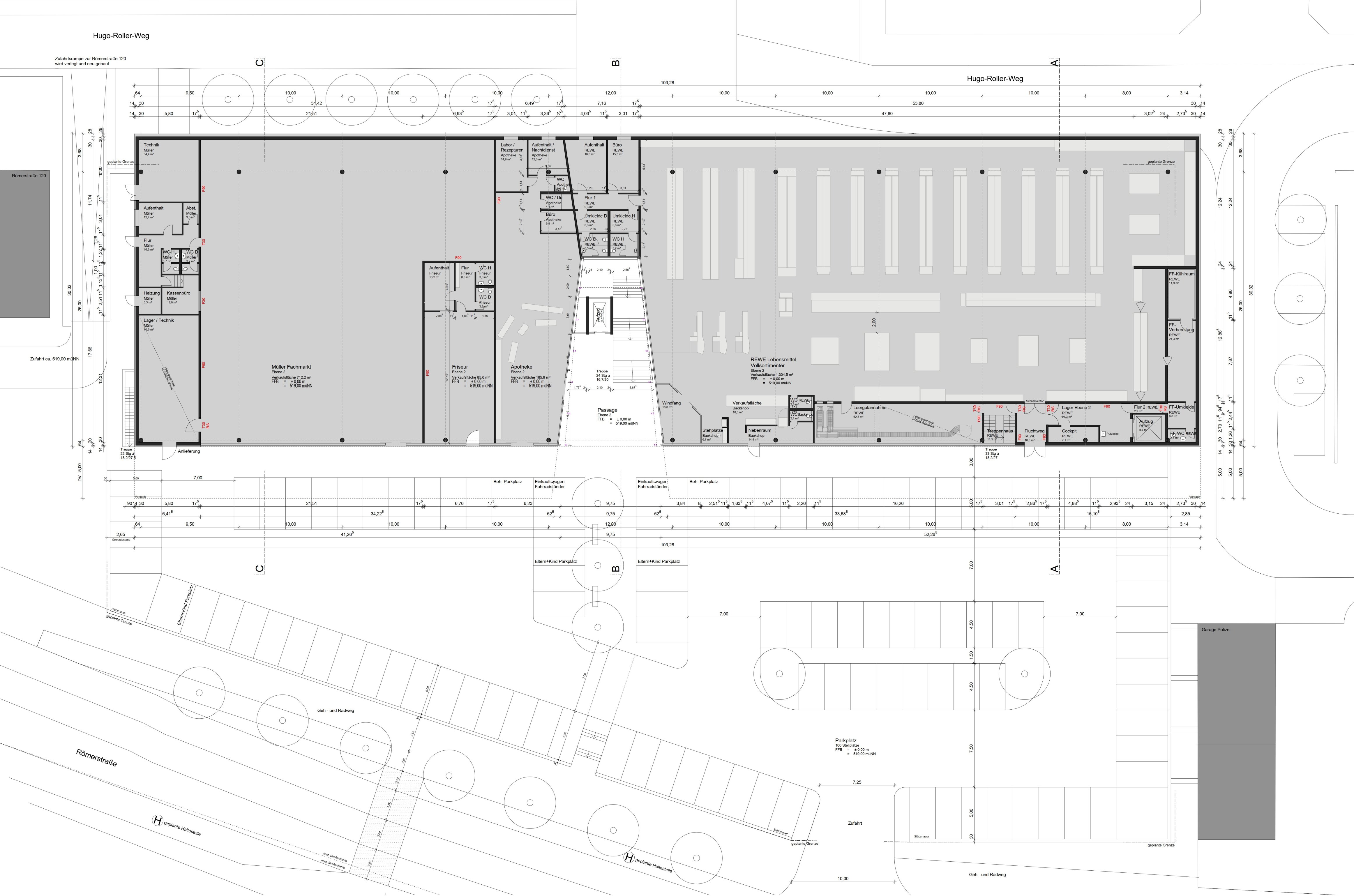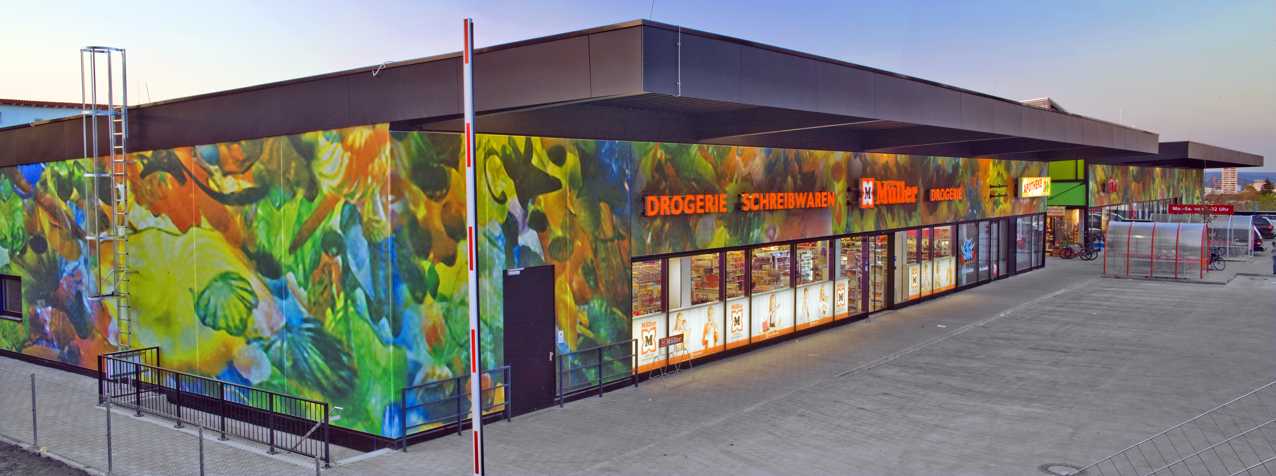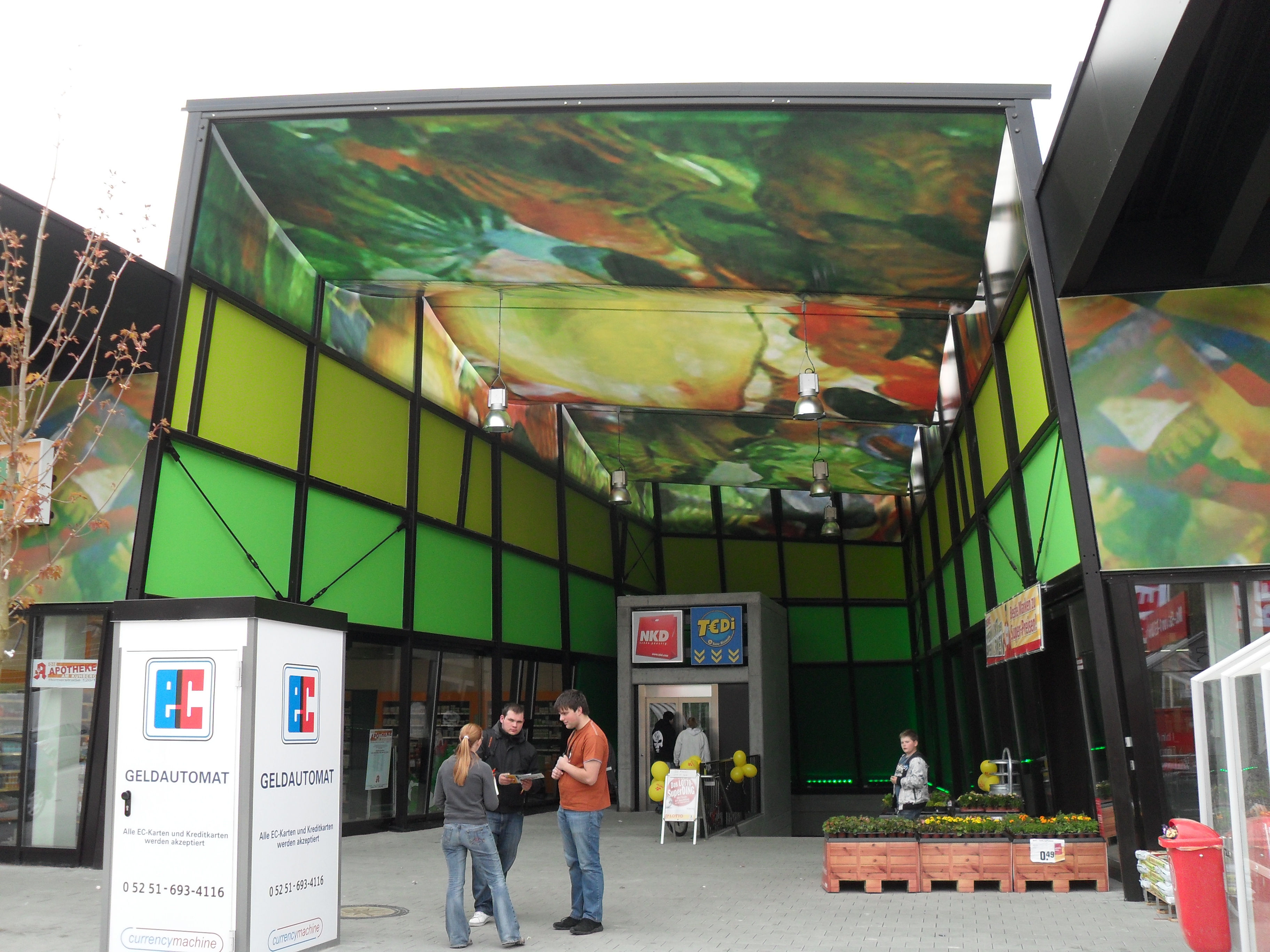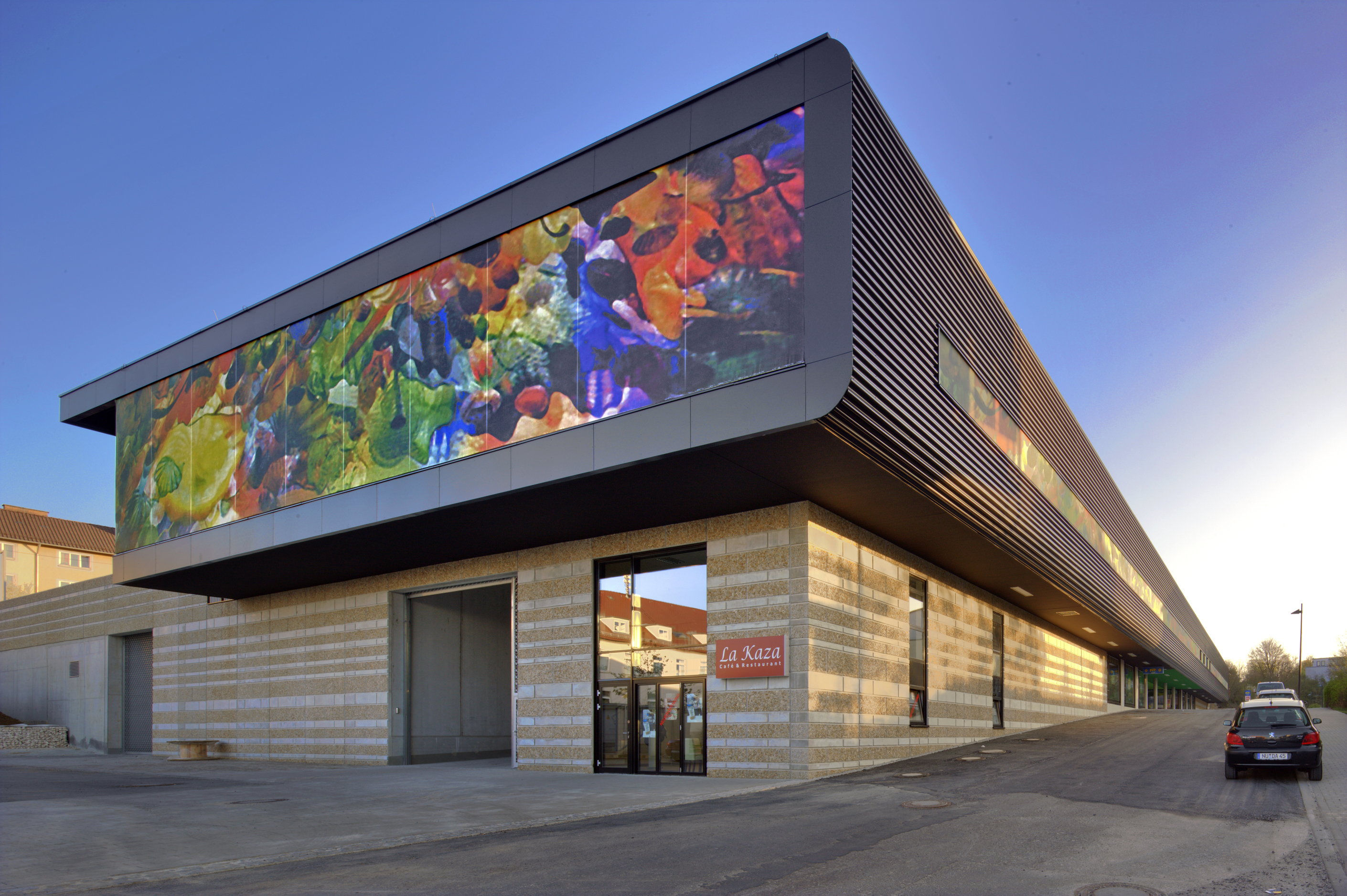 Acht verschiedene Geschäfte befinden sich in dem EInkaufszentrum, dessen besondere architektonische Herausforderung in der Hanglage des Grundstücks besteht. Die Lösung bestand in einer zwei geschossigen Bebauung. Das zum angrenzenden Wohnviertel ausgerichtete Hanggeschoss ist als massiver Sockel ausgebildet. Die repräsentative Wirkung wird durch den in Bänder gegliederten Kalksteinvorsatz erreicht, ein Material, das von Weitem wie ein Fels im Hang wirkt und den regionalen Bezug herstellt. Wie ein Schlitten sitzt das Hauptgebäude auf dem massiven Sockel. Es „umklammert“ die innen liegenden Ladenflächen, die sich dem Besucher nach vorne mit großen Glasflächen öffnen. Die Fassade dagegen überrascht mit einer expressiven farbenfrohen Bemalung, die an Früchte oder karibische Blüten denken lässt.