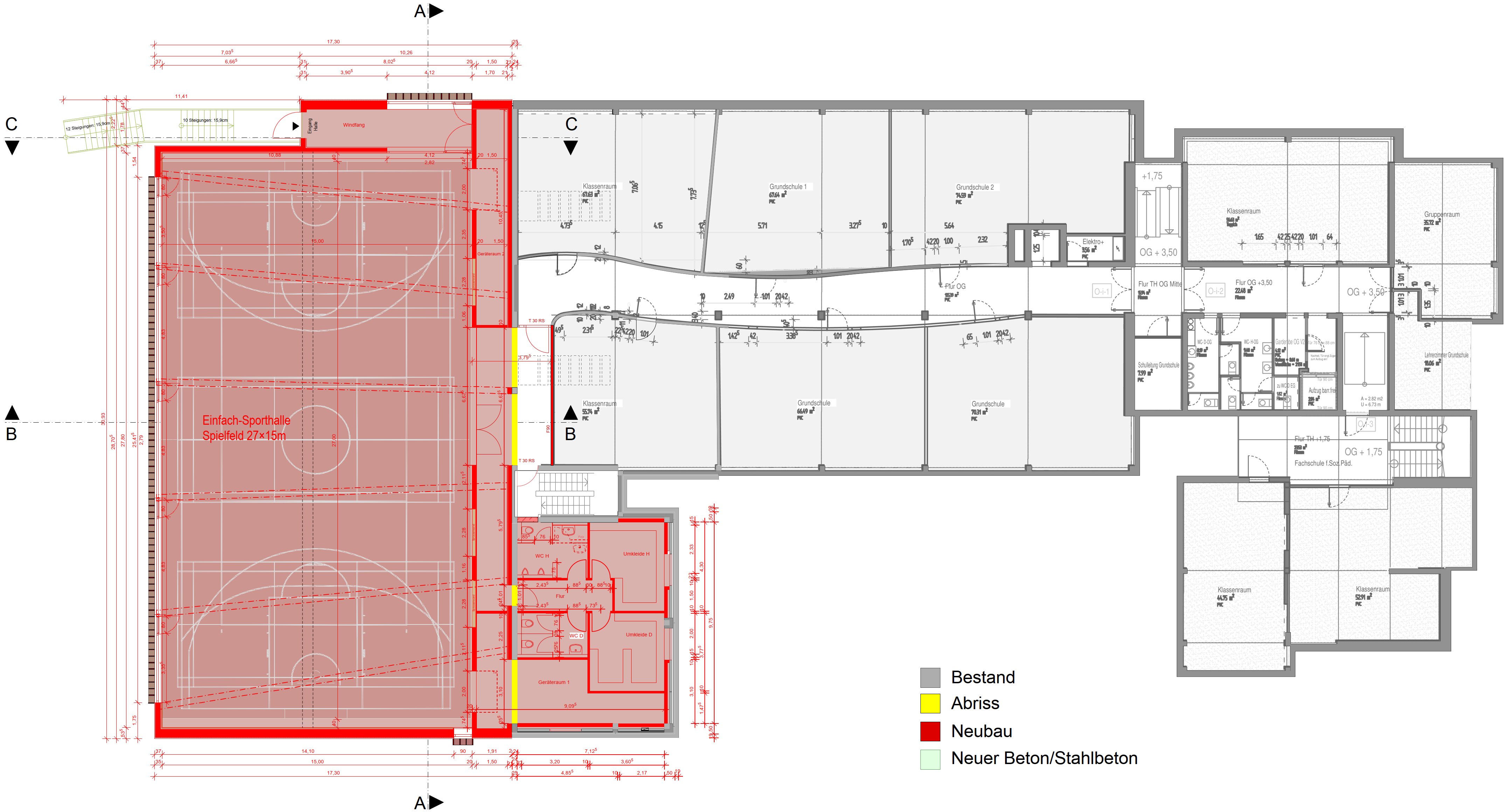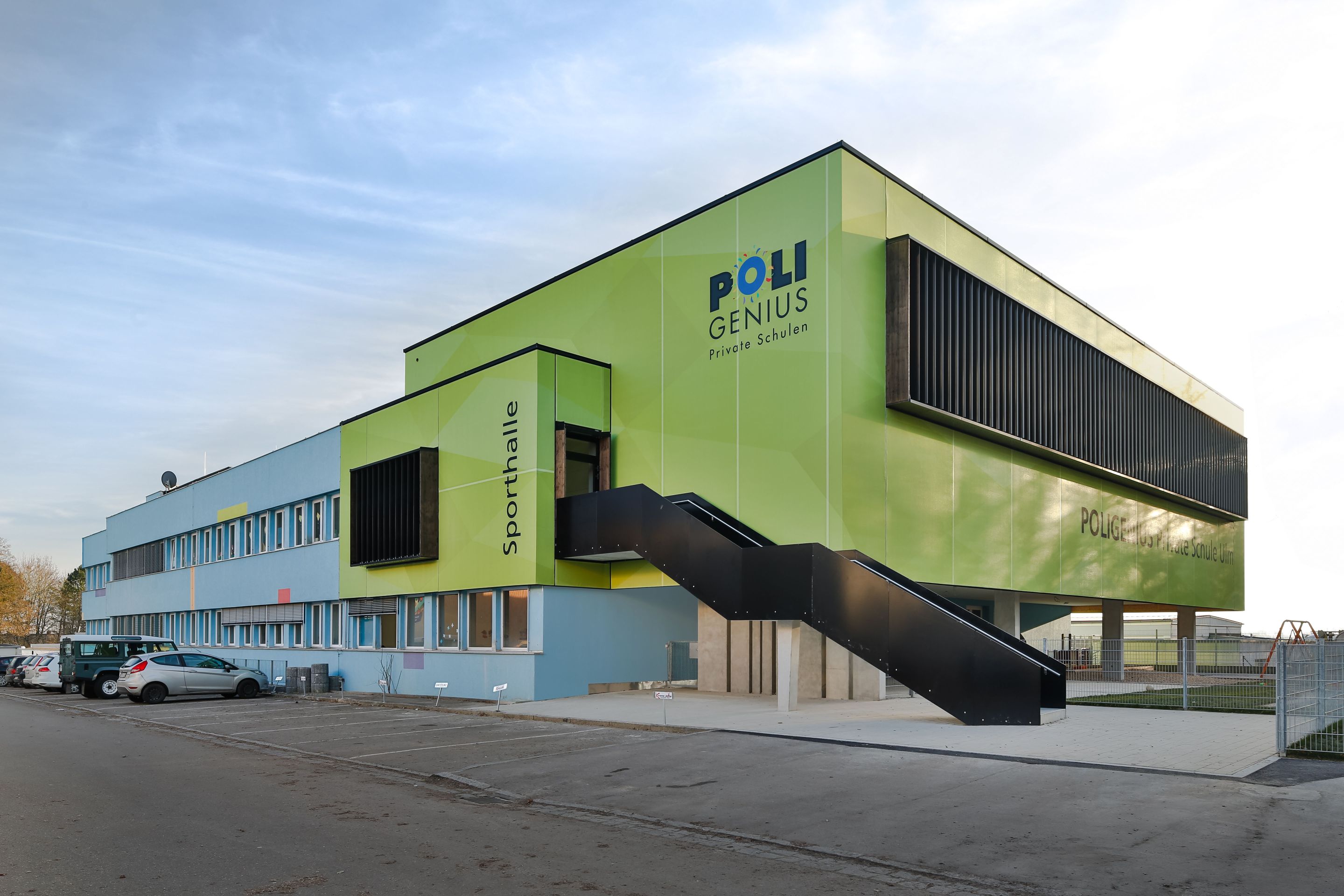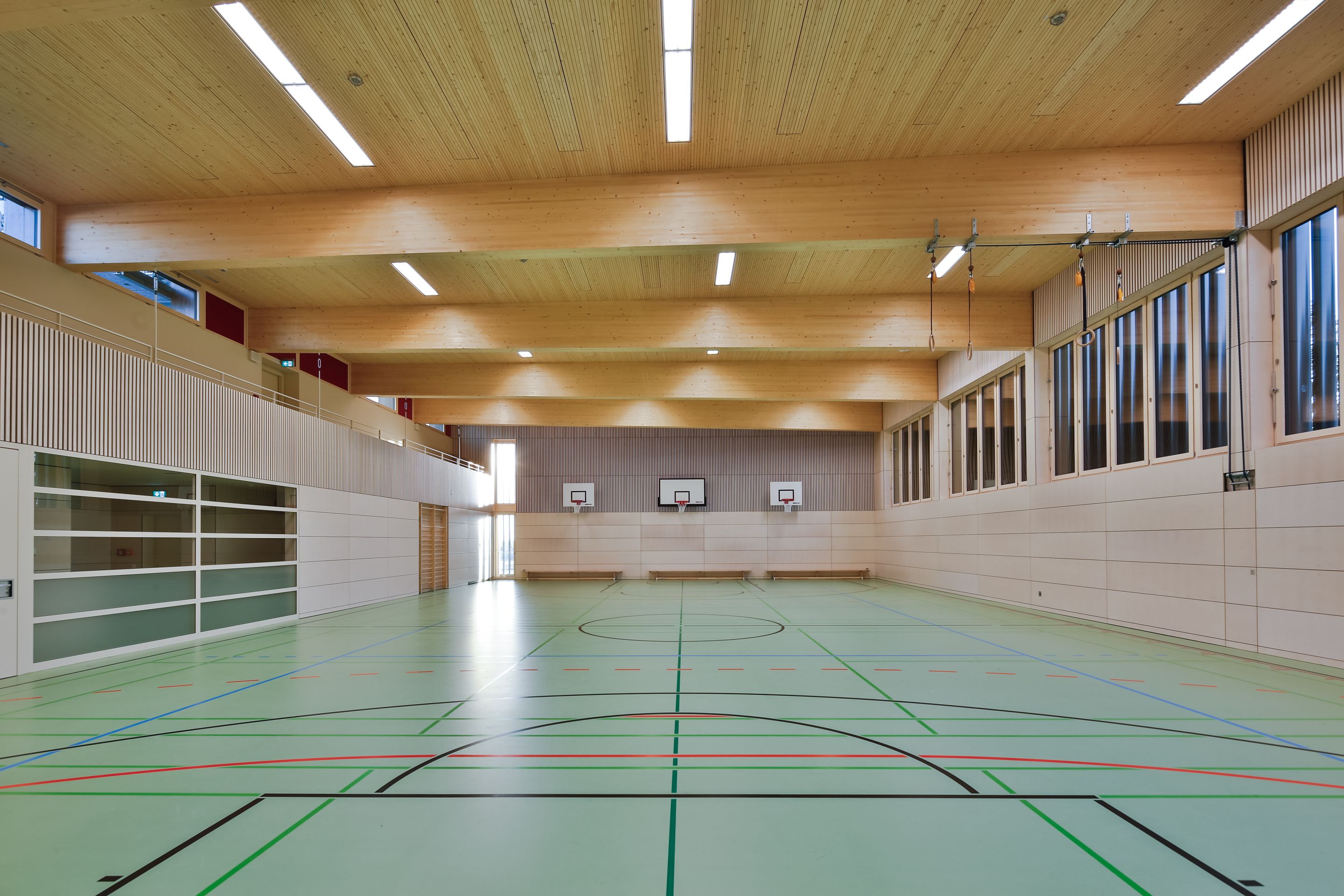 Eine vorgefertigte Holzbauhalle mit all den Vorteilen des Materials: konstruktiv, nachhaltig, ökonomisch, präzise und leicht. Schwebend auf dem bestehenden Kindergarten aufgesetzt, ermöglicht der neue Baukörper die direkte Anbindung an die bestehende Schule im 1. Obergeschoss. Die warme, natürliche Atmosphäre der Holzbauteile (Holztafelwände, Leimholzbinder, Brettschicht, Holzdecke) lädt Kinder und Jugendliche auf wohltuende Weise zu Sport und Spiel ein.