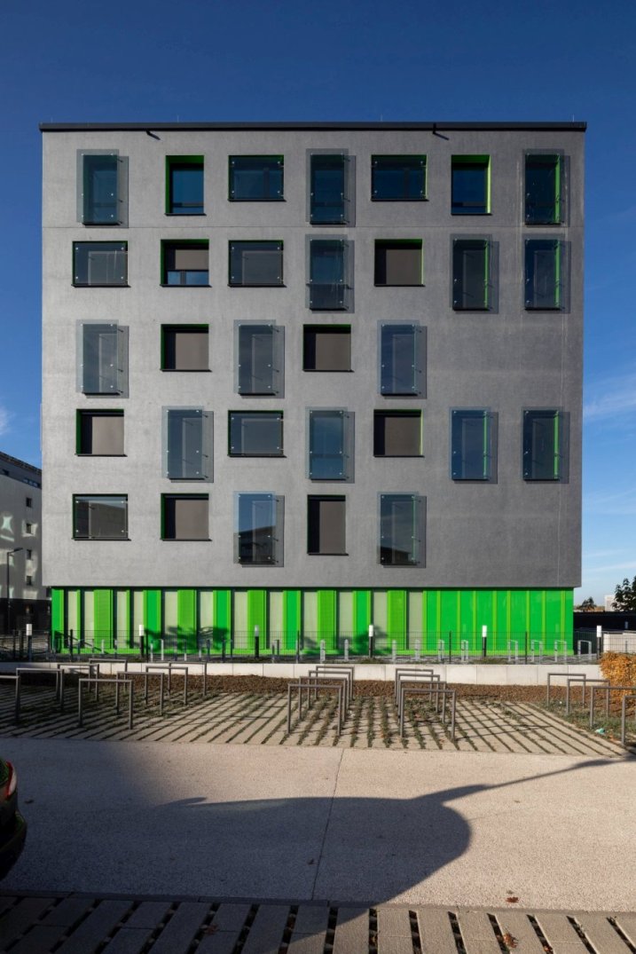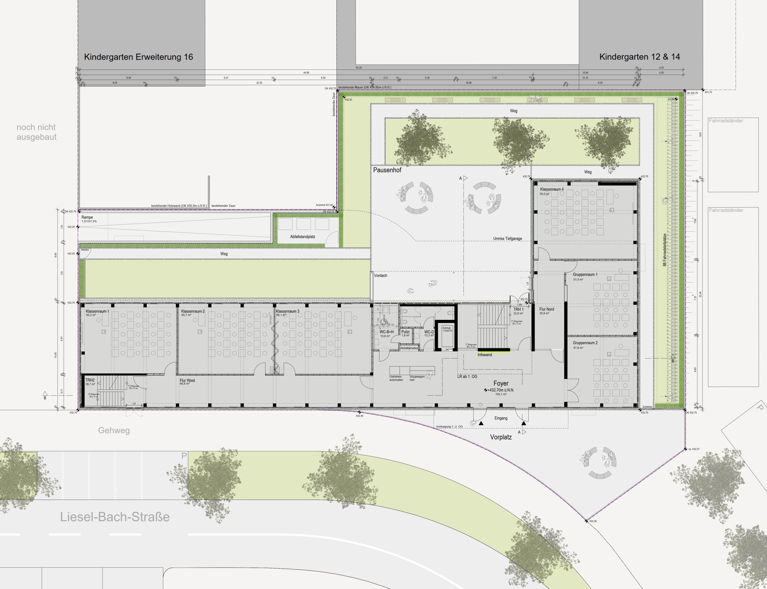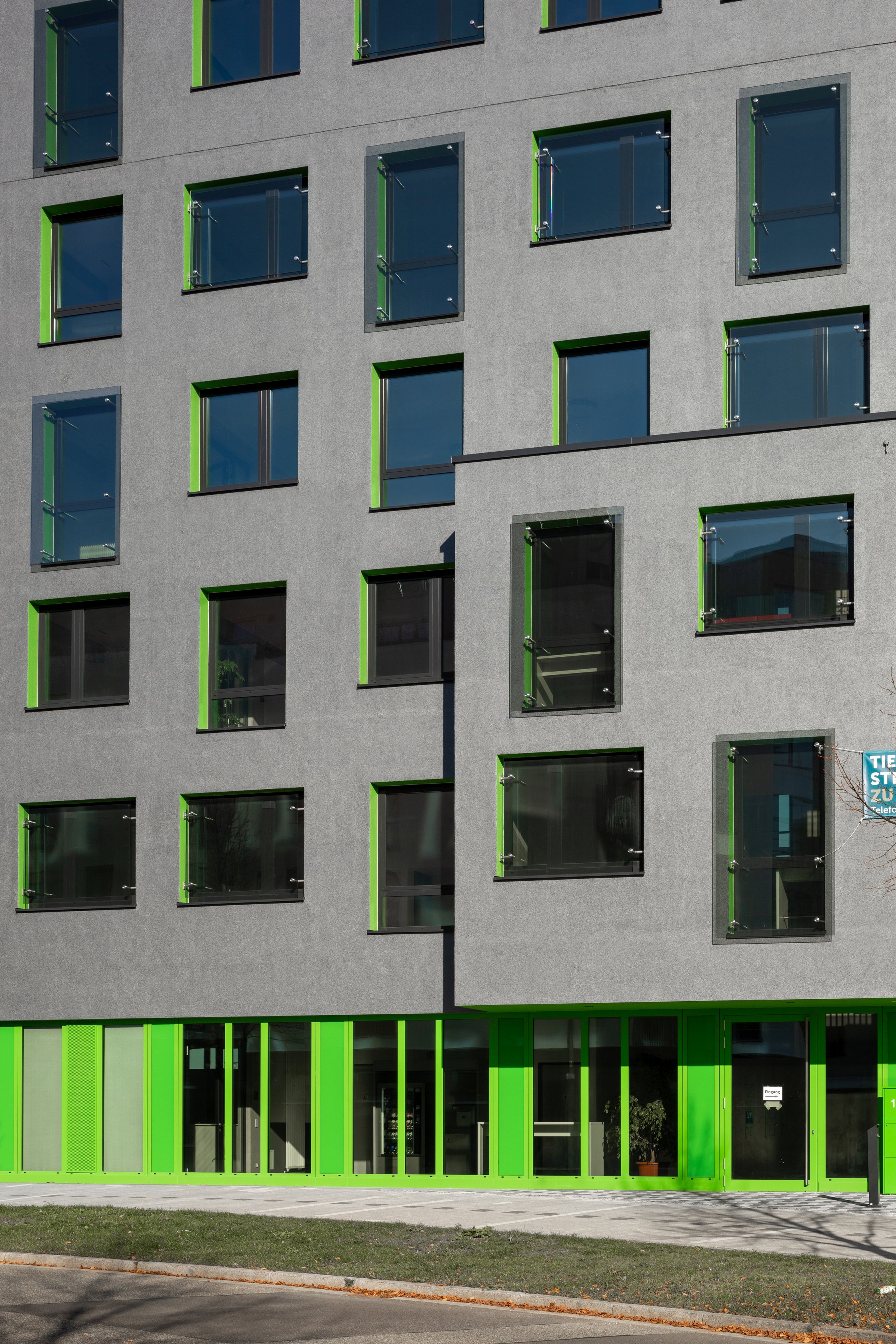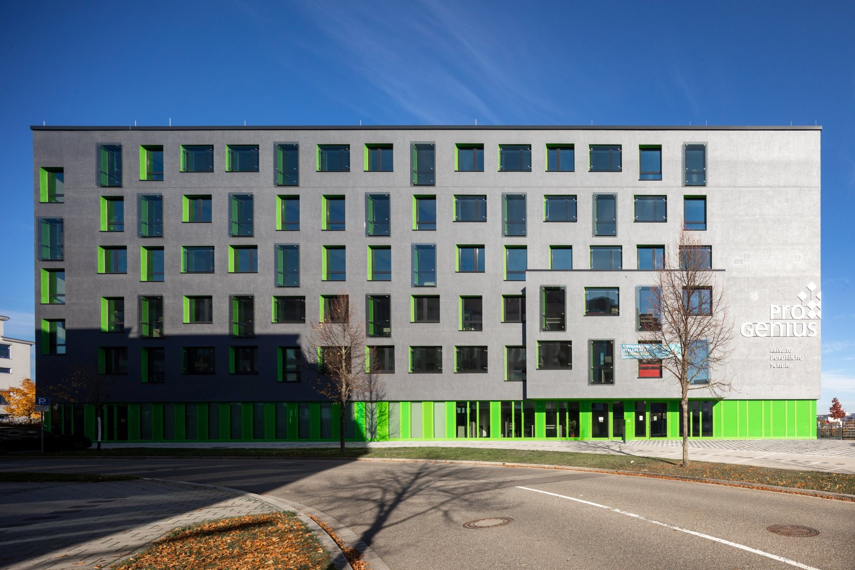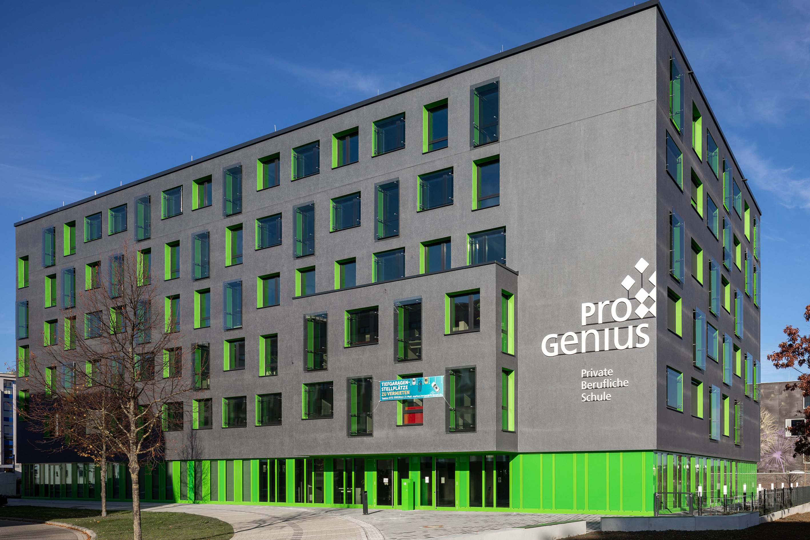 Der Neubau des Schulgebäudes mit 24 Klassen- und Gruppenräumen, offenen Lernbereichen und einem Bewegungsraum bildet den Auftakt für das Bildungsquartier im neuen Baugebiet Flugfeld Böblingen/Sindelfingen. Der winkelförmige 6-geschossige Baukörper schafft einerseits eine raumbildende Gebäudekante zur Erschließungsstraße, öffnet anderseits eine ruhige, vom Verkehr abgewandte Pausenfläche hin zum Grünbereich des benachbarten Kindergartens. Der 2-geschossige Vorbau der Eingangshalle akzentuiert die Straßenfassade. Die für das Progenius-Schulgebäude Stuttgart Maybachstraße entwickelten Wiedererkennungsmerkmale, die „Corporate Architecture“ des privaten Schulträgers wurden konsequent auch auf die neue berufliche Schule in Böblingen angewendet: Das Spiel unterschiedlich großer Fensteröffnungen – zum Teil mit gläsernen Vorsatzscheiben- , das einladende Grün der Erdgeschossfassade, das den dunklen, klar geformten Kubus zum Schweben bringt, sowie die dunkelgraue metallisch glänzende Putzfassade der Obergeschosse mit den grün herausleuchtenden Fensterleibungen verleihen auch diesem Schulgebäude ein klares Alleinstellungsmerkmal, das den Blick auf sich zieht. Der klar geformte Gebäudekubus gibt dem Straßenraum den notwendigen Halt und formt durch seine ruhige, monolithische Gesamterscheinung die