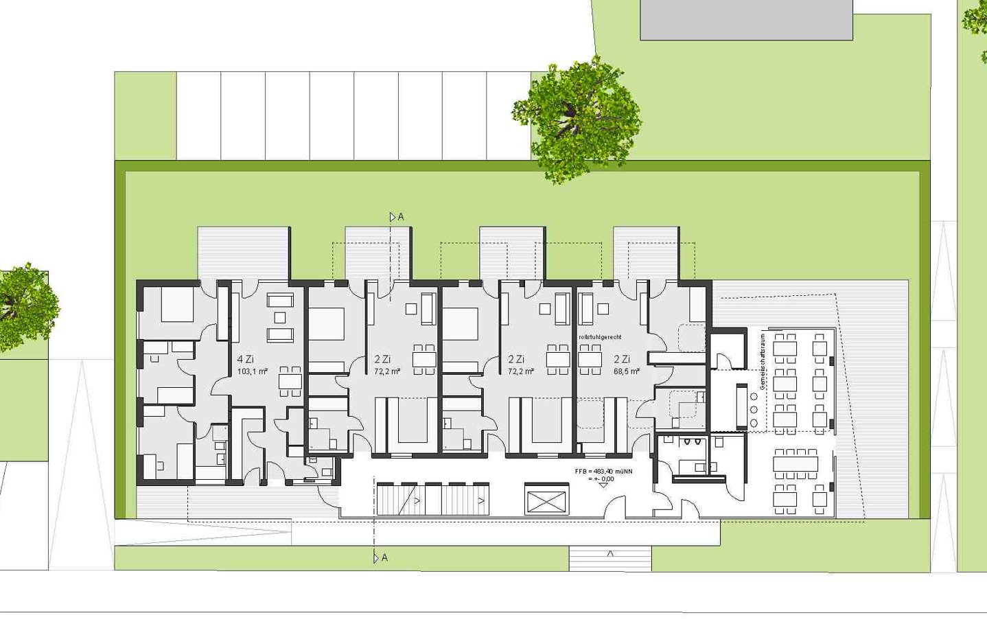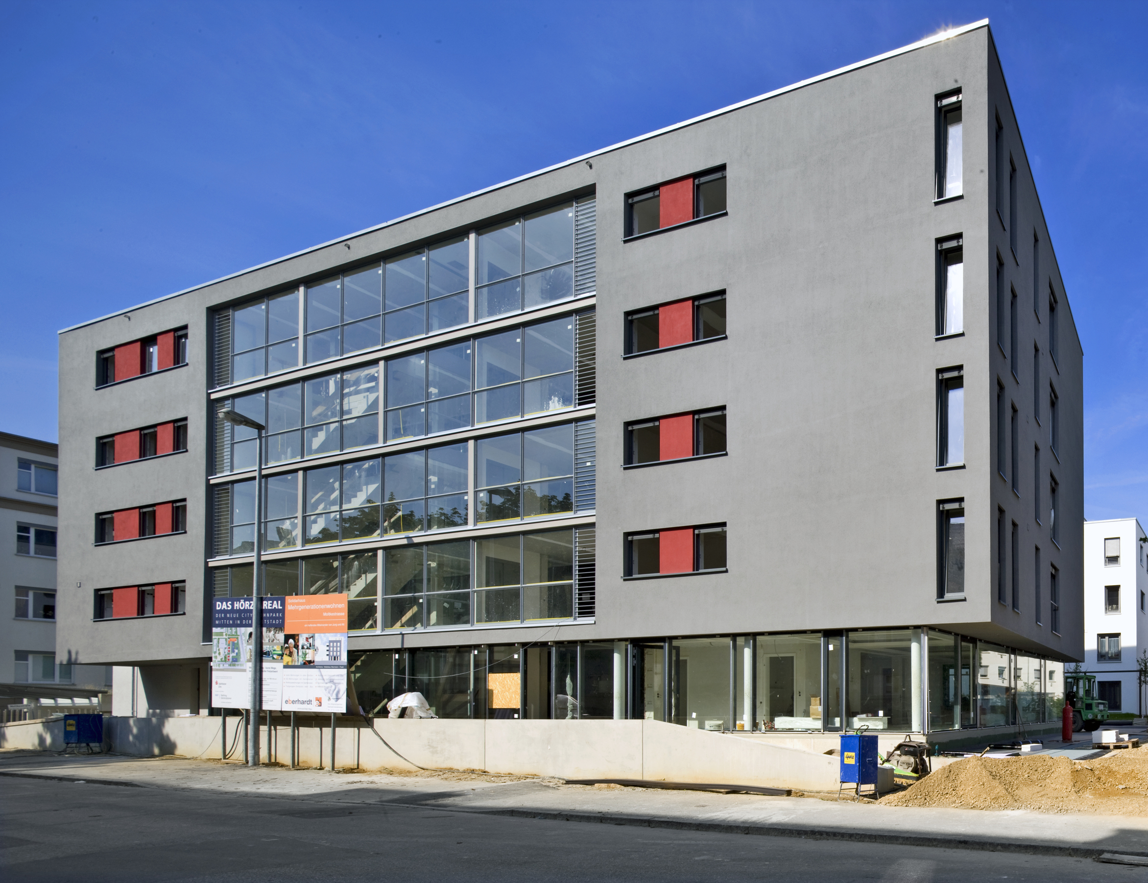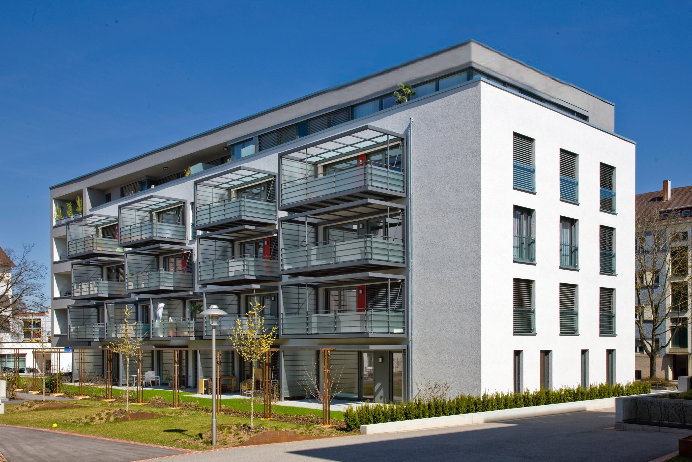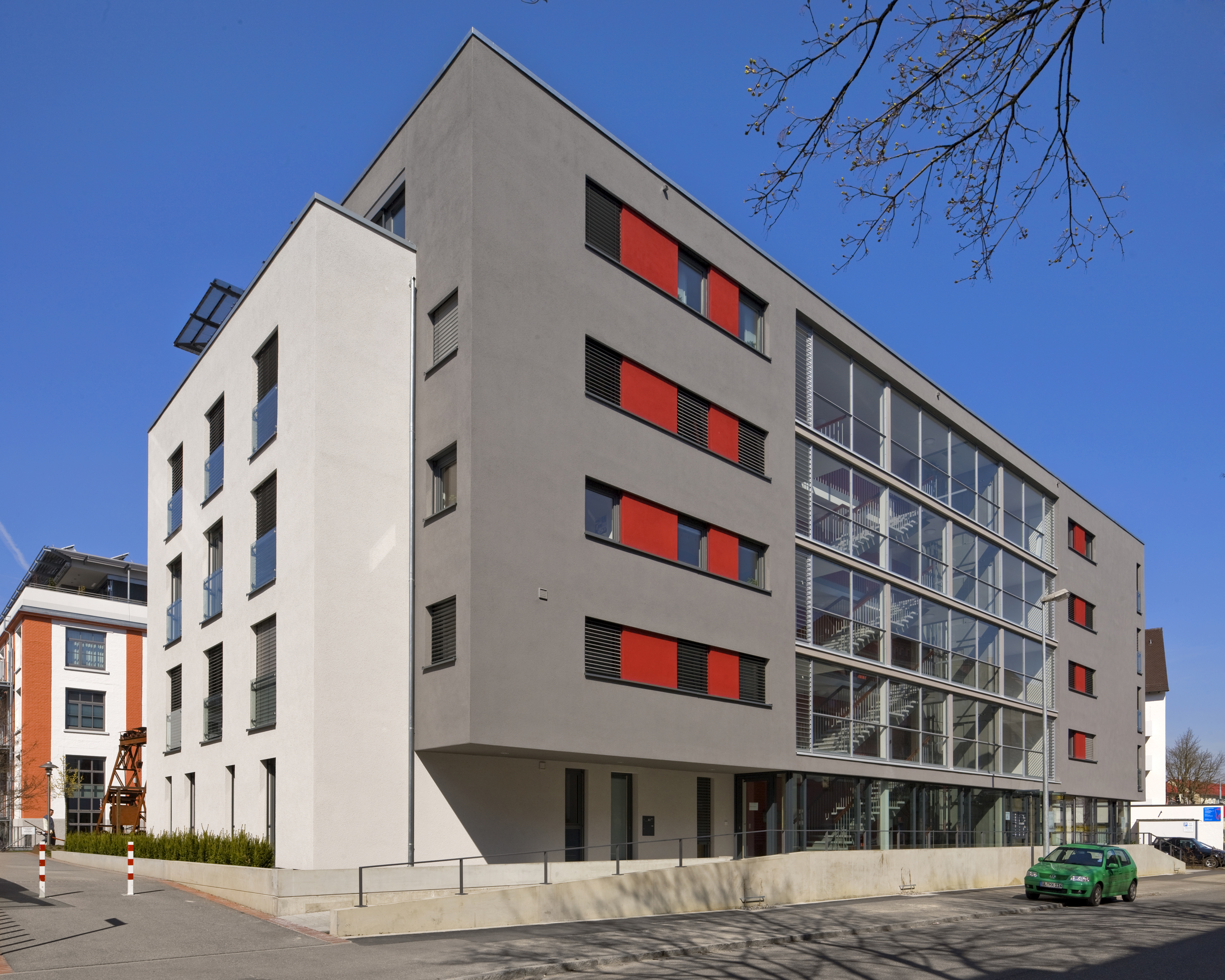 Das Solidarhaus in der Ulmer Moltkestraße gilt als besonderes Modell sozialökonomischen Wohnens. In 24 Wohnungen verschiedener Größe und unterschiedlichen Zuschnitts leben unter dem Aspekt »Hilfe geben und Hilfe bekommen« Bewohner im Alter von vier bis 80 Jahren: Familien mit Kindern, Paare, Alleinstehende, Senioren oder Menschen mit Behinderungen aus verschiedensten Kulturkreisen. Sie wollen bewusst Teil einer Gemeinschaft sein und dennoch in ihren eigenen vier Wänden leben. Um dieses Konzept zu unterstützen werden sechs Wohnungen je Etage über ein gemeinsames, sehr großzügiges Treppenhaus erschlossen, das durch eine große Glasfront das Innenleben wie in einem Schaufenster sichtbar macht. Auf jeder Etage steht den Bewohnern viel Fläche für gemeinschaftliche Aktivitäten zur Verfügung und der im Erdgeschoss liegende eigentliche Gemeinschaftsraum dient auch als Begegnungsort mit der Nachbarschaft. Zwei ineinander verschränkte Kuben, geschossweise versetzt, gliedert den Bau, schaffen eine sinnige, überdachte Eingangssituation und bilden zum Hof hin einen niedereren, gestaffelten Baukörper, dessen Maßstab sich angenehm der Umgebungs-Architektur anpasst.